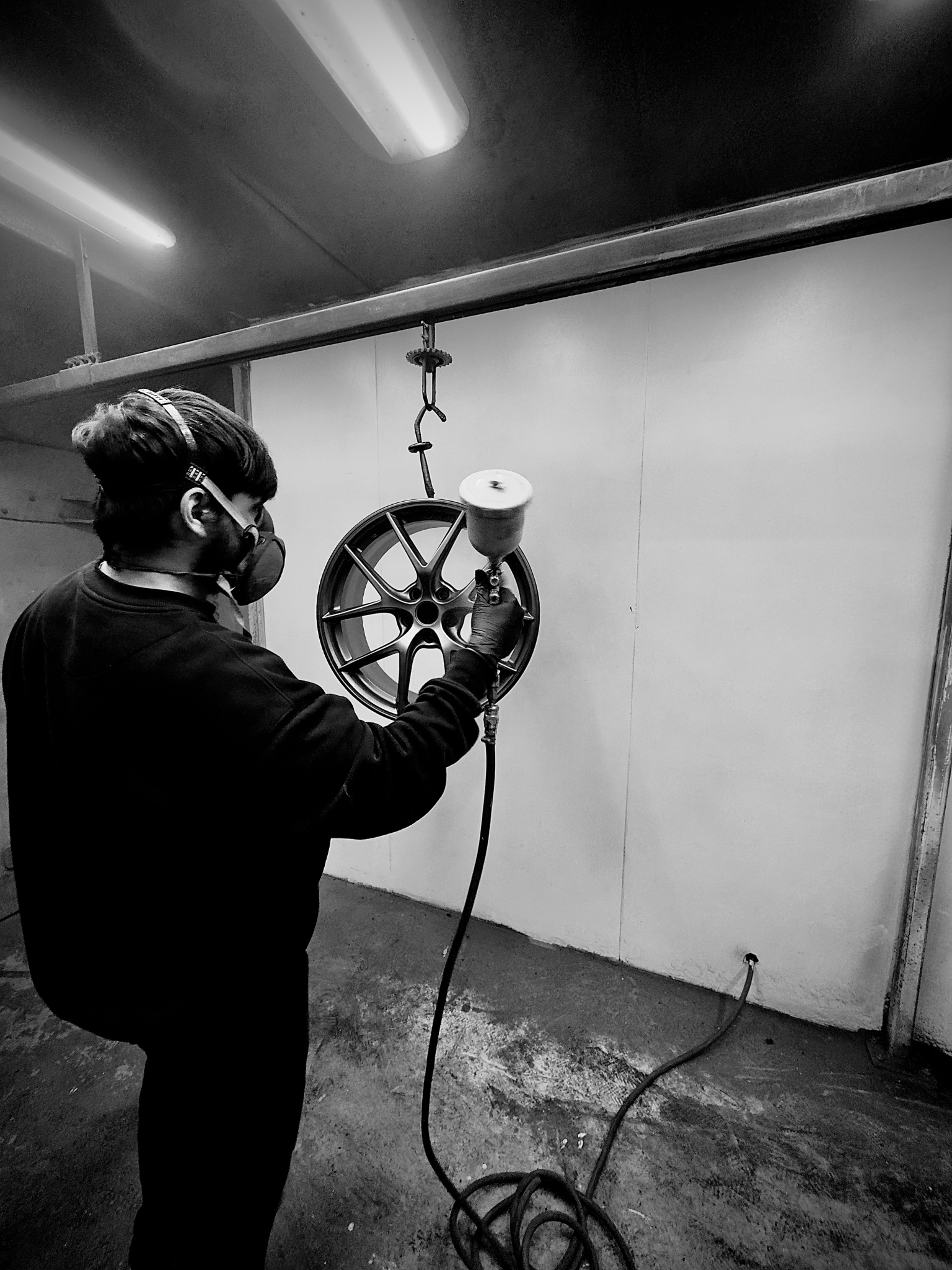 If the wheels are painted, base coat is applied via a gravity fed spray gun until required coverage is achieved.